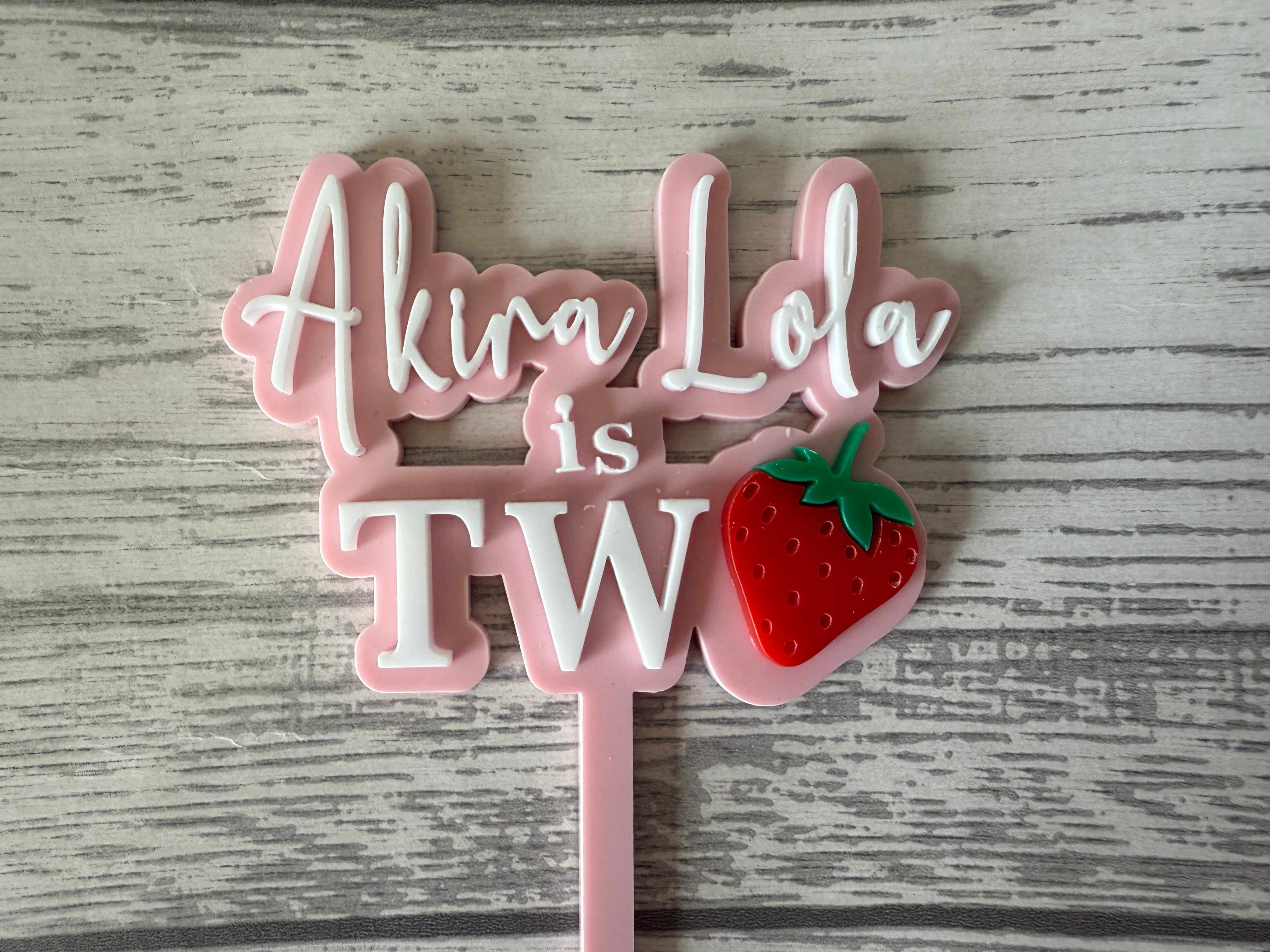 Personalised WELSH 2 layer acrylic Strawberry NAME is ONE birthday cake topper